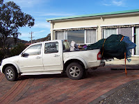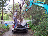 ..Starting at around 1.5m around the base i worked my way int to root-mass to find that it was only around 900mm x 350mm and no tap root to speak of . With a drag chain placed around the roots ,the machine simple dragged the tree into a position where he could simply sling the base and lift it into the ute . With the tree loaded i slipped extra large plastic bags over the foliage and then wrapped the canopy with shade-cloth to prevent damage from wind burn for the 4 hour trip home .