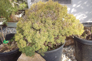 age . With the new Spring growth bursting i allowed the tree to rest and recover for another 4 weeks during this time i carved a shari down the full length of the trunk,small but affective..After the new growth had extended i then removed another 30% of the canopy,stimulating a further burst of new buds and shoots . Continually trimming the new growth by pinching out the tips the canopy was beginning to thicken , so a further reduction of the branches was to take place . Once again another burst of new shoots has appeared and began to burst . This transformation from neglected tree to bonsai has taken less than 6 months . It is currently wired in the traditional method and is recovering very well . It has pride and place in my vast collection of Bonsai and trainers.