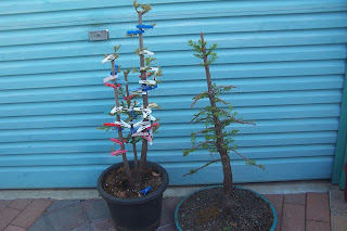 The Norway Spruce was part of a ute load of reject trees purchased from a little old lady who has a healthy obsession with collecting rejected/damaged nursery trees from far and wide . I clapped my eyes on it and low and behold it was in the ute in a flash , along with the rest of the trees . Butchered and neglected this would transform into something resembling an aged Spruce battered by nature. I removed it from its pot to find it was growing in recycled garden mulch from the local council , treated pine , plastic even a shredded aluminum can was entangled in the root ball . With a quick trim of the branches to remove the unsightly foliage and a severe root prune it was placed into the bonsai pot . Further training would take place in 4 weeks . I used the hook and hold method to pull the branches down into their new position , carefully the tree has taken on a completely new image . On the thicker branches i use electrical cable coating to protect the bark from dam