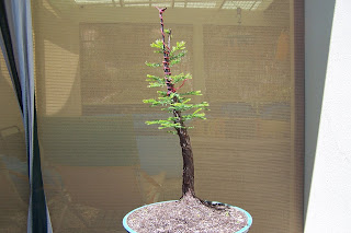 age . With the new Spring growth bursting i allowed the tree to rest and recover for another 4 weeks during this time i carved a shari down the full length of the trunk,small but affective..After the new growth had extended i then removed another 30% of the canopy,stimulating a further burst of new buds and shoots . Continually trimming the new growth by pinching out the tips the canopy was beginning to thicken , so a further reduction of the branches was to take place . Once again another burst of new shoots has appeared and began to burst . This transformation from neglected tree to bonsai has taken less than 6 months . It is currently wired in the traditional method and is recovering very well . It has pride and place in my vast collection of Bonsai and trainers.