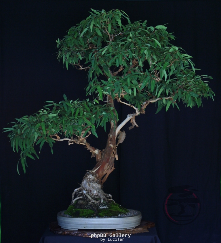 Smooth-barked apple. This species is neither an apple nor a true gum tree, but is related to the Eucalyptus. Grown from nursery stock in Victoria and over 50 years old, this tree is 1.40 m. high. As such it belongs to the “Imperial” category of bonsai. It has been a well known tree in Victoria for many years and was included in a book on bonsai in the 1990s. It is very reminiscent of the tree in the wild. The artist is one of Australia’s best known bonsai artists with over 50 years of experience, who is particularly skilled in the growing of native bonsai.