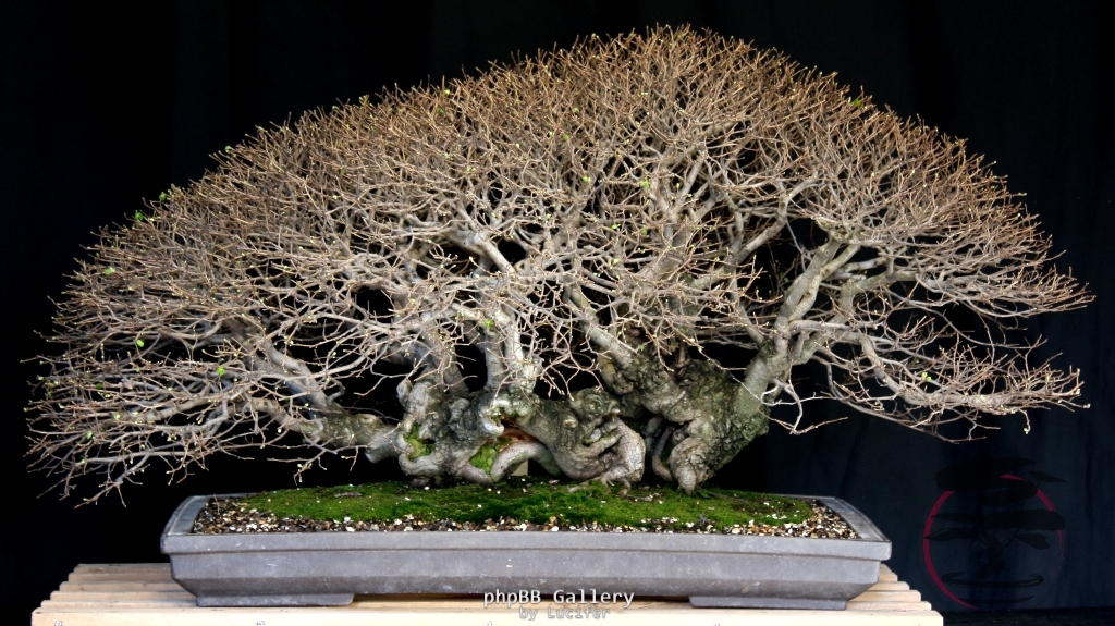 English elm. This is by far and away one of the most exciting natural “raft style” bonsai in the world. In 1988 it was dug from a farmer’s paddock in Gippsland Victoria where it had been grazed for many years by cattle. Over the years it has passed through the hands of a few owners but it is the present owner who has brought the tree to its current state of perfection. The ramification of this tree is best appreciated in winter and springtime as the new buds emerge.