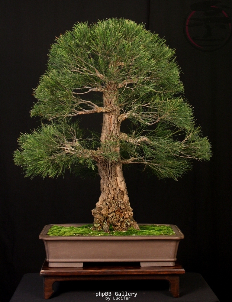 Forest oak. This tree was purchased as very young nursery stock and has grown slowly over the intervening years since the late 1980s into a magnificent Australian native bonsai. It is a good example of how, with proper care and skill, Australian natives can become world class bonsai. The amazing bark is a great feature of this species as well as the needle like foliage.