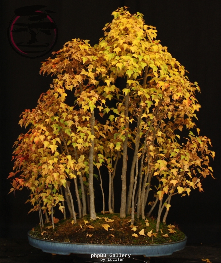 Trident maple. The trees for this group planting were individually grown from cuttings by the artist, over a period of 13 years. Different rates of growth resulted in trees of different sizes, which is essential to obtain a natural look in a bonsai group. The trees were assembled in 1998 and trained as a group from then on. The West Australian artist is a keen advocate of Japanese bonsai values and methods, and a highly experienced demonstrator.