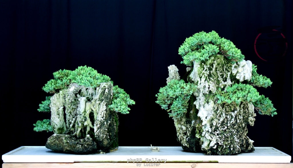 Juniper squamata prostrata. Penjing is the Chinese art of miniature landscapes with an emphasis on the rock rather than the trees. In this setting you see use of rock, trees and figurines to give the feeling of a natural, living landscape that includes the influence of humankind. This group was assembled in 2000, under the guidance of well known Chinese master Penjing exponent and author Hu Yunhua. It uses imported Chinese “reed-pipe” rock and junipers. It is displayed on a traditional Chinese marble tray. The foliage is intended to look like clouds surrounding the limestone peaks seen in parts of southern China.