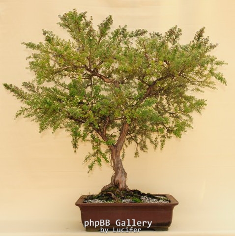 Notes: This is a spreading form of the Woolly Teatree, with blue-ish foliage and white flowers in summer. I grew this plant from a cutting 20 years ago and first commenced some shaping for bonsai 14 years ago. It has developed a magnificent trunk [and bark!] over this time.