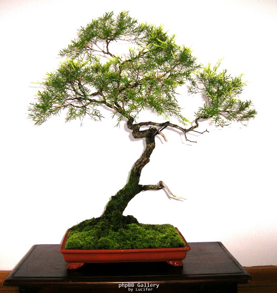 I am unsure of the age of the tree which I originally bought as 2 year old tube stock around 6 to 8 years ago. It was transferred to a 200 cm pot and neglected for some time. In about 2004 it was heavily wired to get movement in the trunk and branches. I purposely tried to keep it on the small side so I could have it inside when it flowered and also enjoy the beautiful spring colour of the foliage.